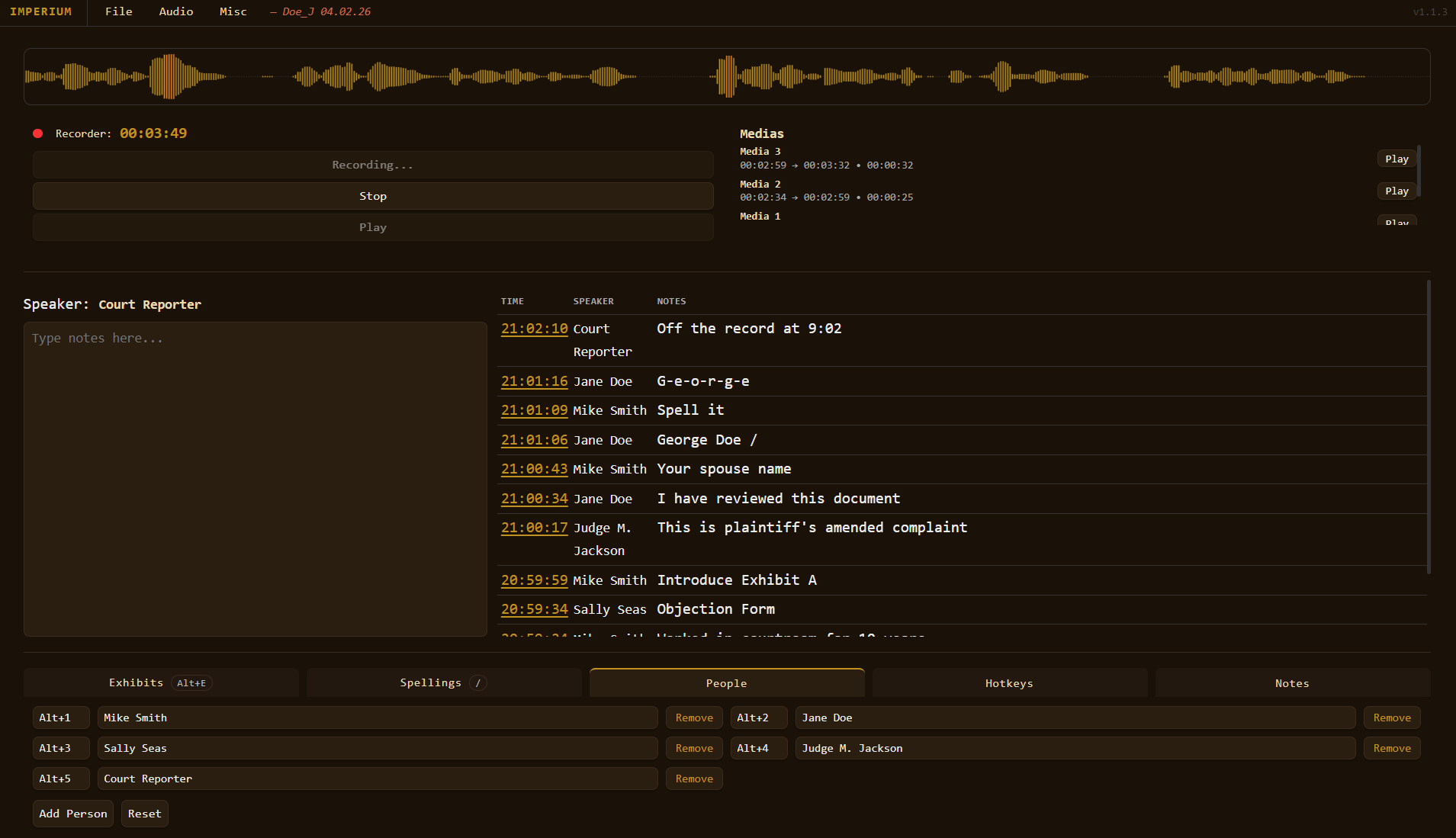 Juggling a recorder, a notepad, and a transcript is exhausting. Speakers get misidentified. Timestamps drift. Exhibits pile up with no clear record. Imperium was designed by legal professionals, for legal professionals — to handle everything in one place, in real time.